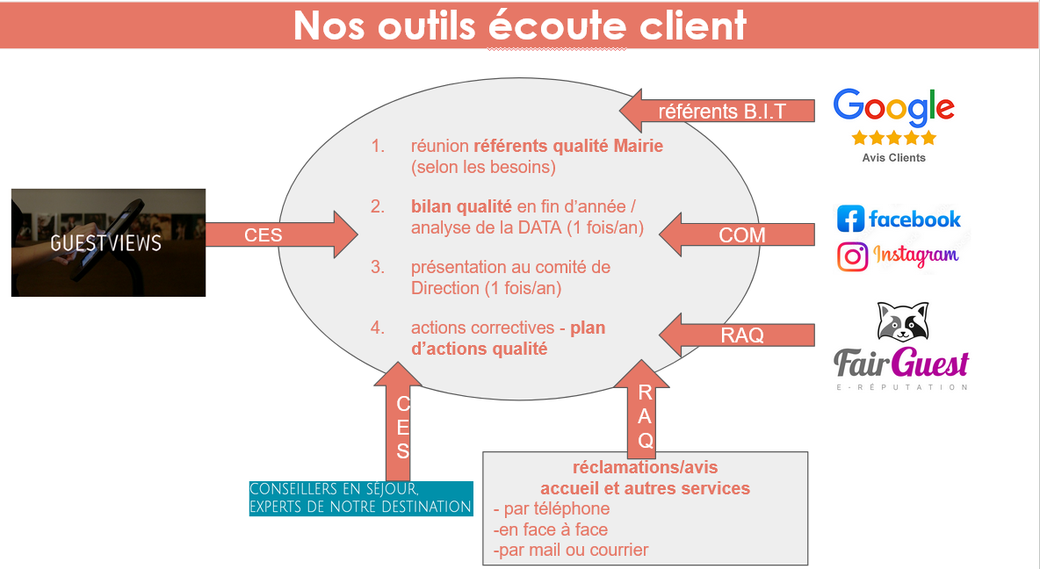Une analyse fine est faite en fin d'année, elle est ensuite présentée en Comité de Direction et à l'ensemble de l'équipe (profil client, satisfaction sur les services de l'OT, accueil des CES, remarques sur l'OT la destination....)
