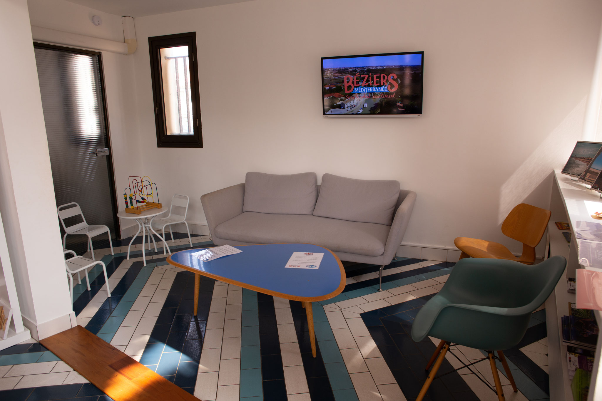 - La documentation Agglo et partenaires est classée sur les étagères dans la réserve, par thématique. La documentation hors agglo est disponible en libre consultation dans le classeur bleu mis à disposition des visiteurs sur le comptoir (on leur propose de prendre les documents en photo). La documentation de l'OT est la plus demandée (carte de l'Hérault, balades à pied, à vélo, horaires des bus ..) se trouve dans les placards derrière la banque d'accueil.